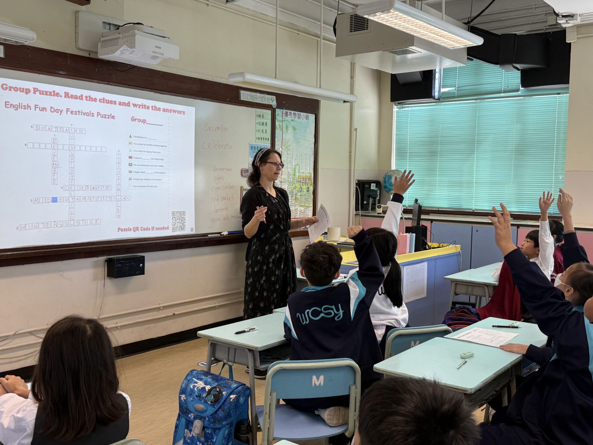 • English Fun Day was on the 26th of November. The theme was festivals. Students enjoyed learning more about the Chinese festivals, Chinese New Year and Winter Solstice. In the lesson, P1-3 students drew pictures and presented their favourite festival for the class to guess. P4-6 students took on a word puzzle about festivals. During the recess times, students played games including matching festivals with the correct meaning and exploring mystery boxes to guess the festival. Students could also vote for their favourite festival and take home QR codes to read books about festivals. It was a wonderful day.