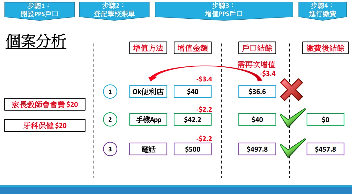 B.帶實體/電子版付款卡或出示parent apps內之繳費PPS條碼,到便利店增值 (OK 便利店、華潤萬家或 VanGO 便利店) [手續費每次 $3.4]