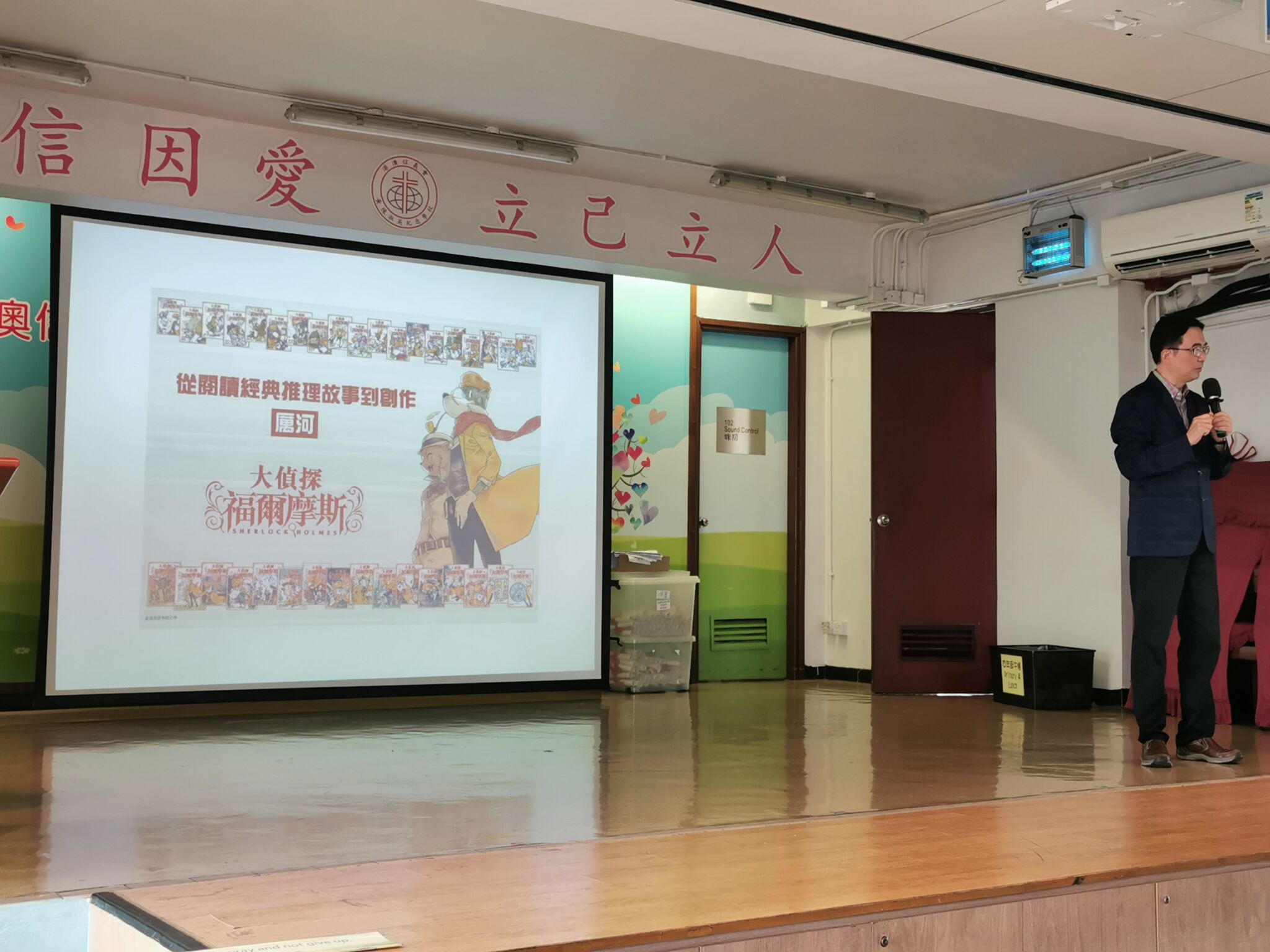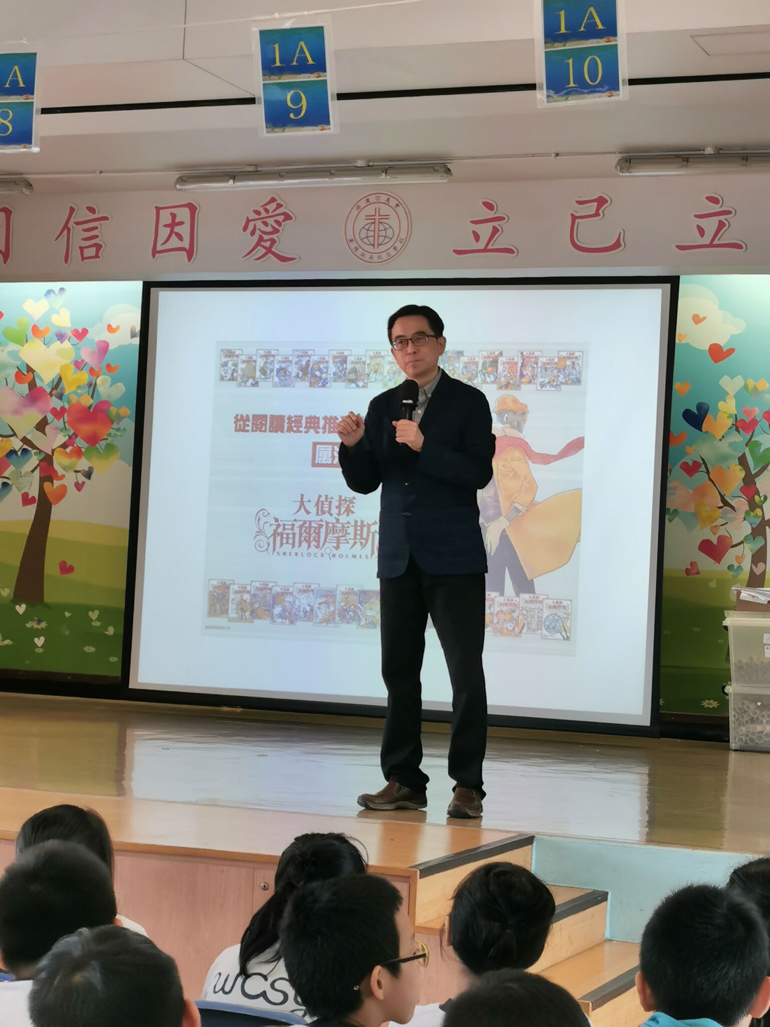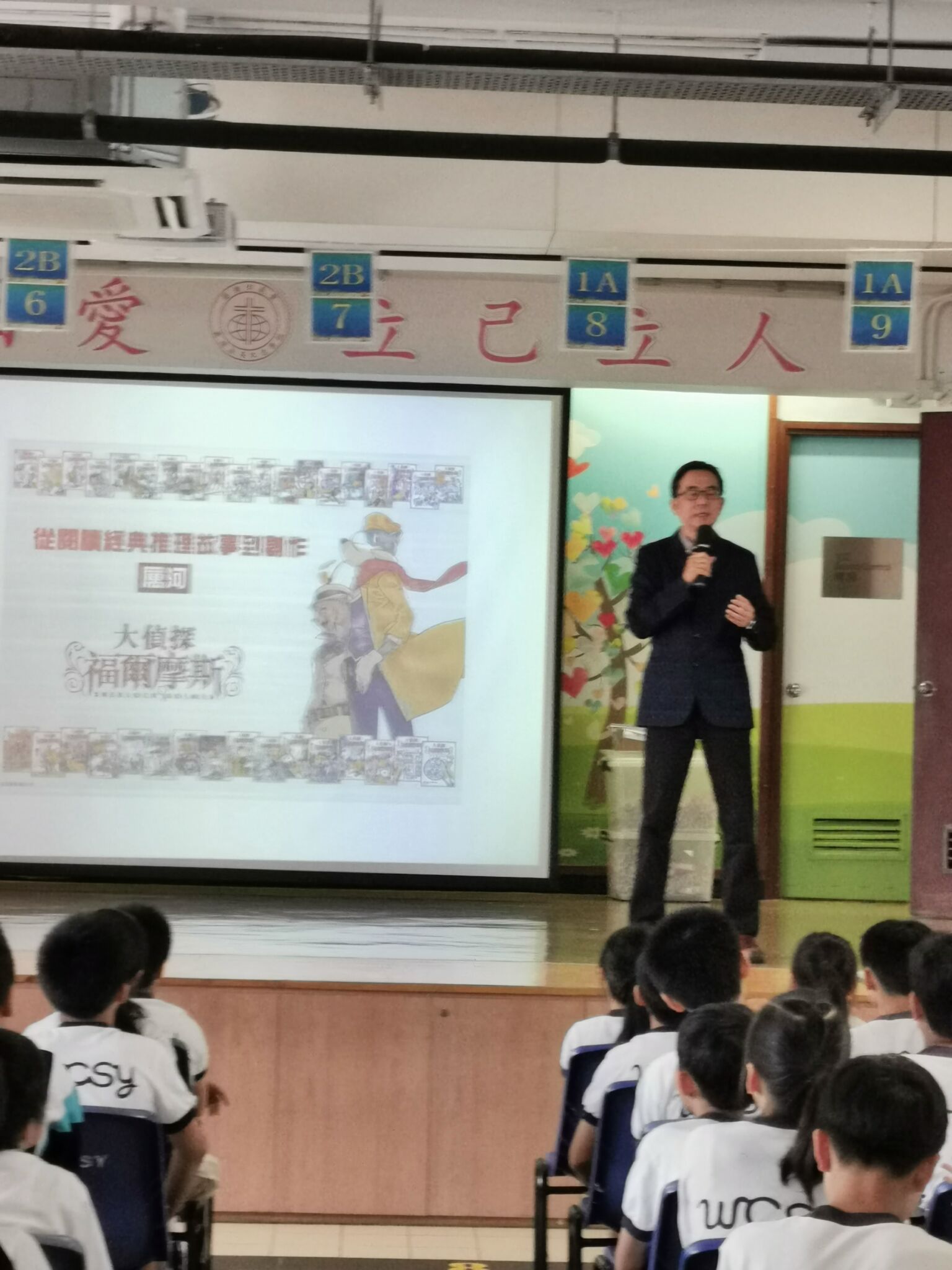 《大偵探福爾摩斯》是一部十分流行的偵探小說,深受中、小學生歡迎。本年度學校有幸能邀請到這套書的作者 —- 厲河先生到校為四至六年級同學主持講座,和同學們分享改編和創作故事的心得。厲河先生用風趣活潑的方式和同學們分享他改編經典故事的五大要訣及如何將科學知識融入案件中,在場的老師和同學都大受裨益,學習到一些寫作的好方法。而厲河先生還在講座中加入有獎問答遊戲,令同學們非常雀躍,積極回答各種相當有難度的提問。最後,厲河先生還為很多小書迷簽名及拍照留念。這次講座得到所有老師和同學們的一致好評,希望借此講座能鼓勵同學們多閱讀,也能啟發他們寫作的興趣。