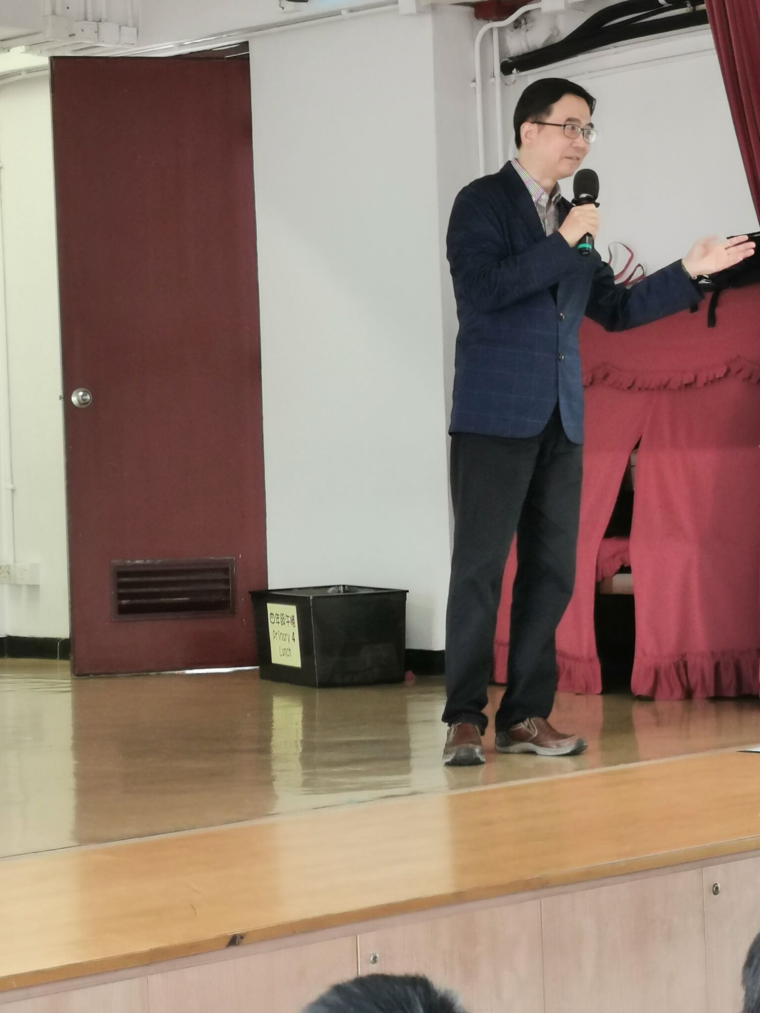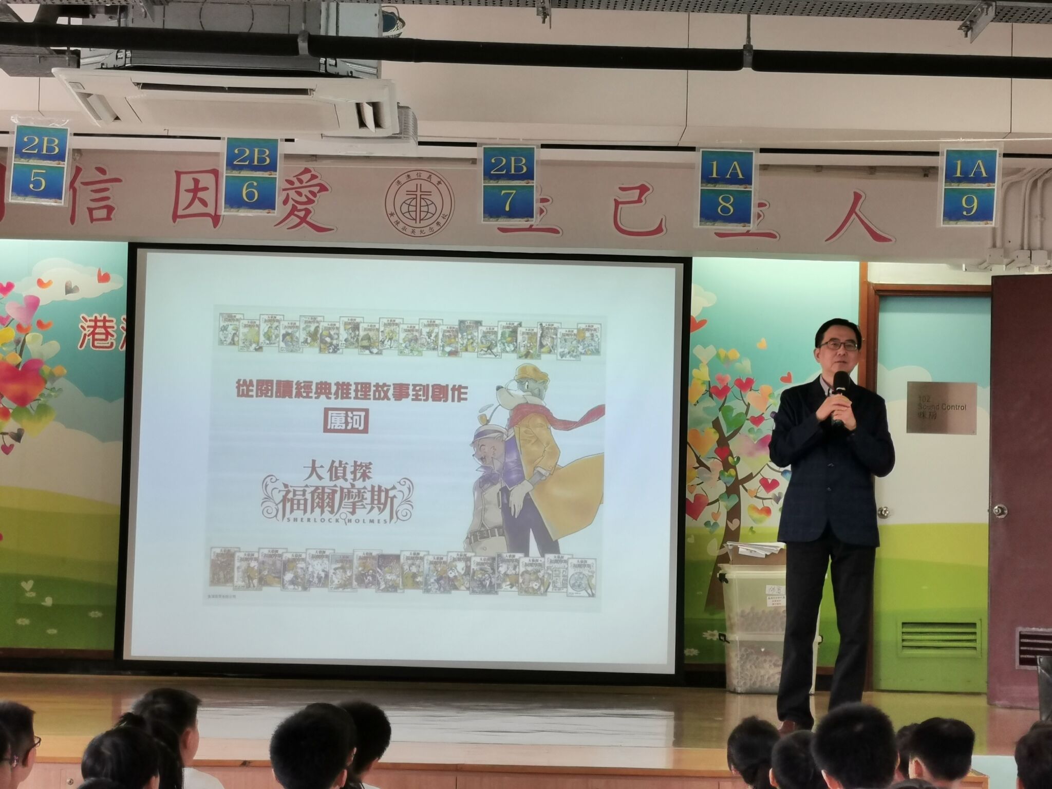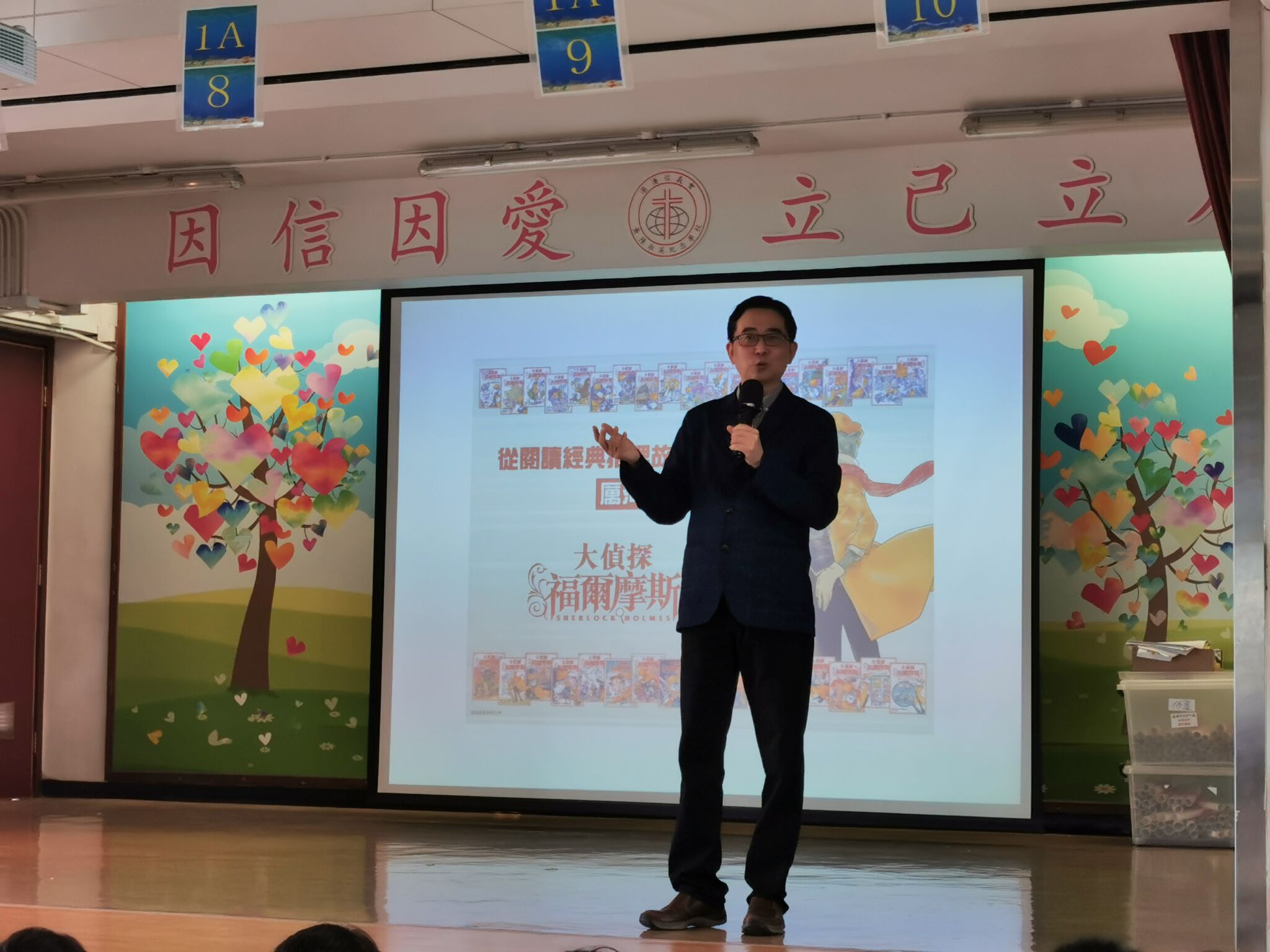 《大偵探福爾摩斯》是一部十分流行的偵探小說,深受中、小學生歡迎。本年度學校有幸能邀請到這套書的作者 —- 厲河先生到校為四至六年級同學主持講座,和同學們分享改編和創作故事的心得。厲河先生用風趣活潑的方式和同學們分享他改編經典故事的五大要訣及如何將科學知識融入案件中,在場的老師和同學都大受裨益,學習到一些寫作的好方法。而厲河先生還在講座中加入有獎問答遊戲,令同學們非常雀躍,積極回答各種相當有難度的提問。最後,厲河先生還為很多小書迷簽名及拍照留念。這次講座得到所有老師和同學們的一致好評,希望借此講座能鼓勵同學們多閱讀,也能啟發他們寫作的興趣。