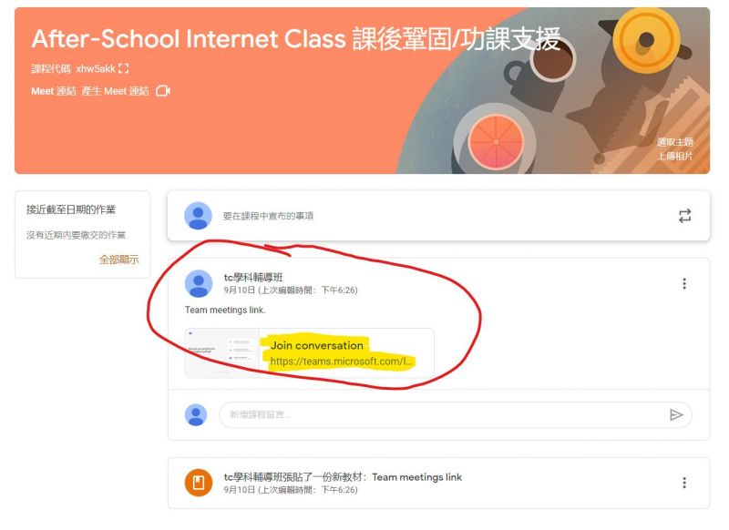 4. After entering the course, find the Teams meetings link and click Join conversation.