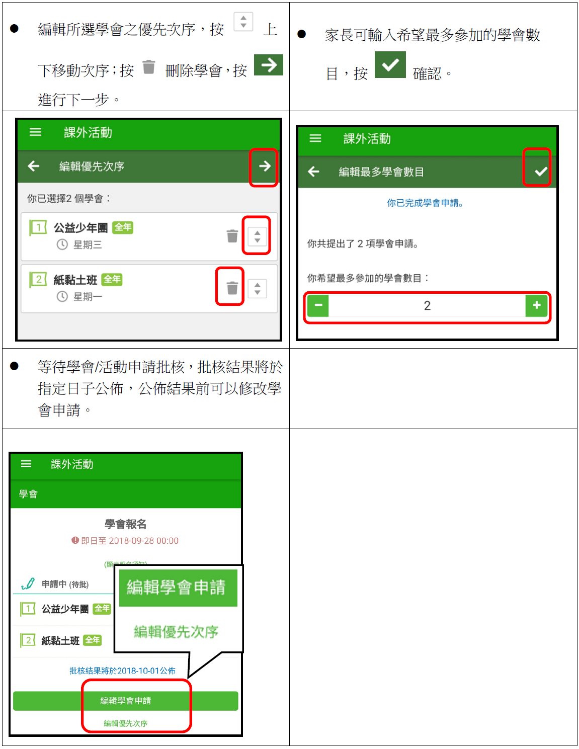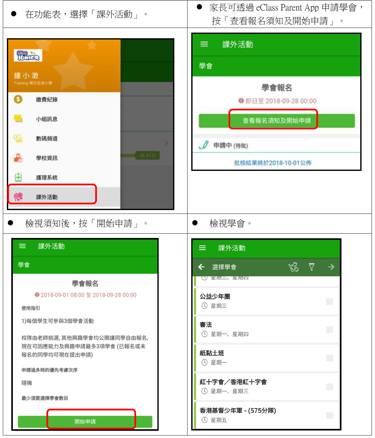 使用eClass Parent App 更多->課外活動->學會->查看報名須知及開始申請->開始申請 申請完成看到 批核結果約於20XX-XX-XX公布,即成功申請,可於公布日期查看申請結果。 使用eClass Parent App:
