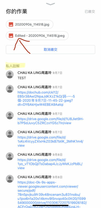 >你的作業:可以看到你所交的功課及老師發回的批改內容(檔案名稱會顯示為 已編輯),點擊可打開查看。