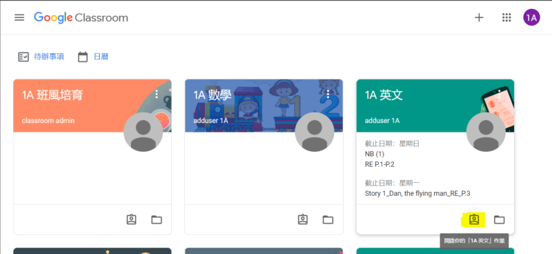 - 方法1: 按一下課程卡上的「你的作業」圖示 。