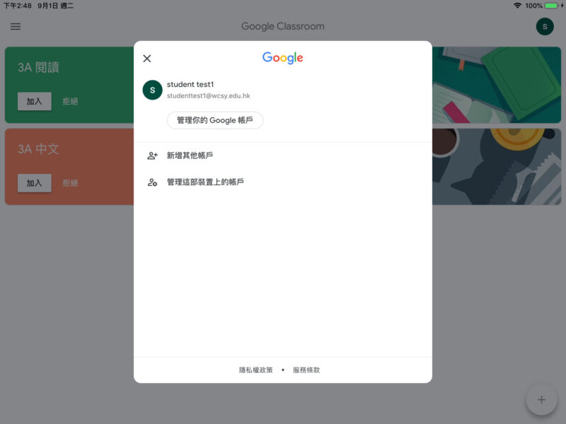 (如填寫測驗或功課的google form出現沒有權限,請在該瀏覽器前往www.google.com,在頂端按一下您的 個人資料圖片或姓名縮寫 切回學校帳戶,然後回到 Classroom 重新打開相關名單一次)