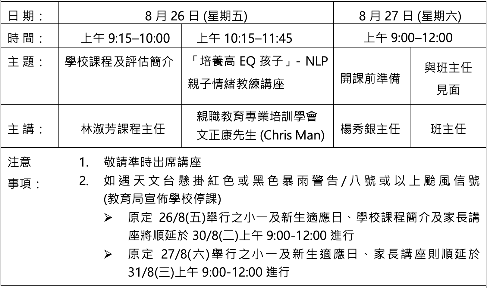 為了幫助一年級學生及新生家長掌握更多培育子女的技巧,以迎接小學新的學習階段,本校將於開學前舉行兩天家長講座,茲將有關家長講座的詳情奉告如下,誠希各位家長撥冗出席,與我們携手合作,培育學生成長。 (由於疫情,每個家庭最多兩位家長出席活動 *點此觀看回校之防疫安排)